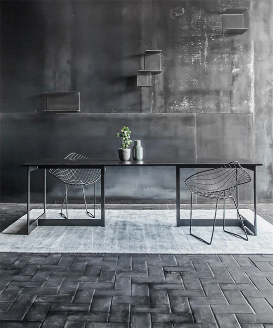 Dimensions : l 200/250/300 x h 75 x p 100 cm Une table aux multiples facettes où les pieds sont interchangeables, en se positionnant selon nos envies. Plateau en acier pour un effet Matière amplifié.