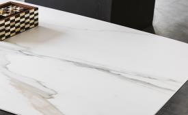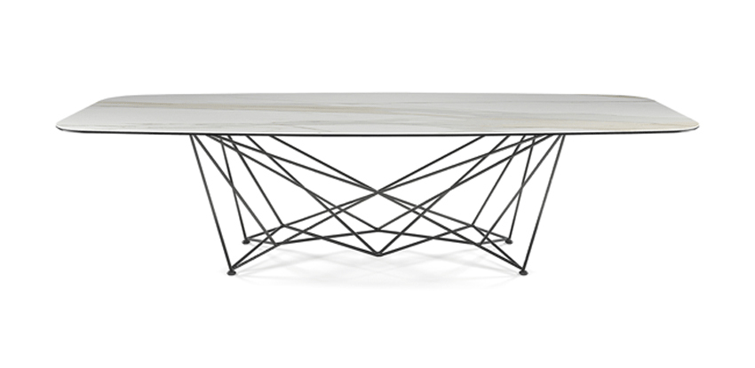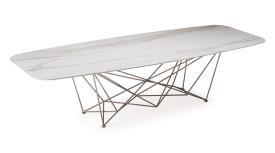 Table d'extérieur avec base en acier laqué gaufré titane (GFM11), graphite (GFM69) ou blanc (GFM71). Plateau en céramique 12mm dans la couleur Golden Calacatta opaque (OD05).