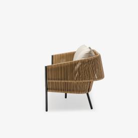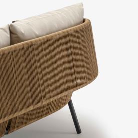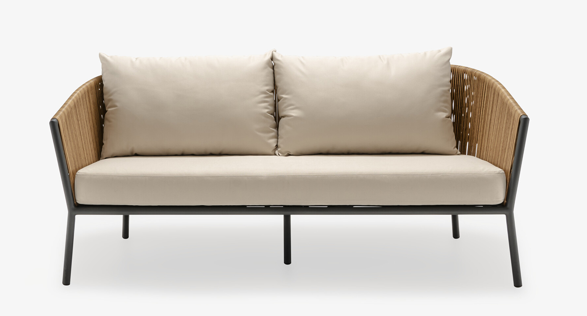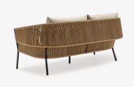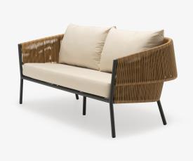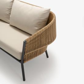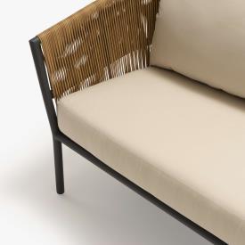 Canapé pour 2 ou 3 personnes constitué d'une structure en aluminium laqué coloris charbon, d'un dossier en rotin synthétique tressé (polyéthylène haute densité) et d'un coussin d’assise en mousse polyuréthanne "Soft" 24 kg/m3 - tissu 100 % polyester beige (sous housse polyester), coussin dossier 65 x 55 x ép 20 cm, intérieur Rollofil 100% polyester.