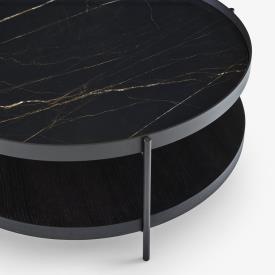 La table basse Hoggar tire son nom du massif montagneux du Hoggar, situé en plein cœur du Sahara, un paysage sculpté par le temps où se mêlent roches sombres et nuances dorées sous le soleil brûlant du désert. Son plateau supérieur en grès imitation Sahara, avec ses veines caramel noir brillant, évoque les reliefs et les strates minérales de cette région mythique, tandis que son plateau inférieur en frêne teinté brun sombre rappelle la robustesse des terres arides du désert. Associant des matériaux nobles à une silhouette contemporaine, Hoggar est une invitation à la découverte d’un univers minéral, brut et raffiné, où le design puise son inspiration dans la nature majestueuse du Sahara. La table basse est composée d’une structure acier laqué brun gris (ral 8019) finition satinée, d’un plateau supérieur en grès Céram imitation Sahara noir brillant, et d’un plateau inférieur en panneau aggloméré allégé plaqué frêne teinté brun sombre, vernis satiné.