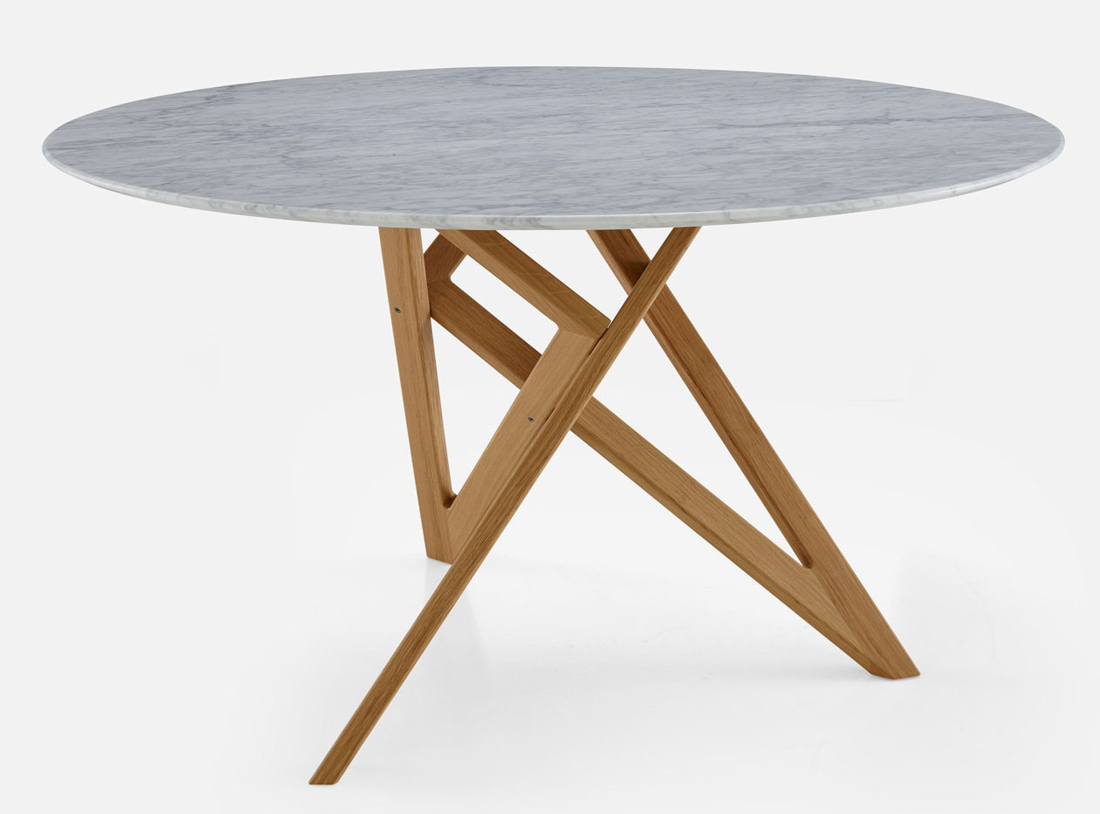 La table de repas Ennea (Ennea signifie le chiffre 9 en grec) repose sur un piètement constitué de trois triangles ''rectangles'' identiques en bois massif. Trois triangles, trois cotés, ces neuf segments forment neuf vecteurs, neuf directions dans l'espace qui forment un agencement à la fois simple et sophistiqué. La construction rappelle la structure pyramidale d'un cristal, légère et robuste. C'est d'équilibre et de tension qu'il s'agit ici, plus que d'un dessin statique. L'assemblage est simple mais donne une impression de sophistication. Cette table peut accueillir de 6 à 10 couverts selon les dimensions.