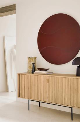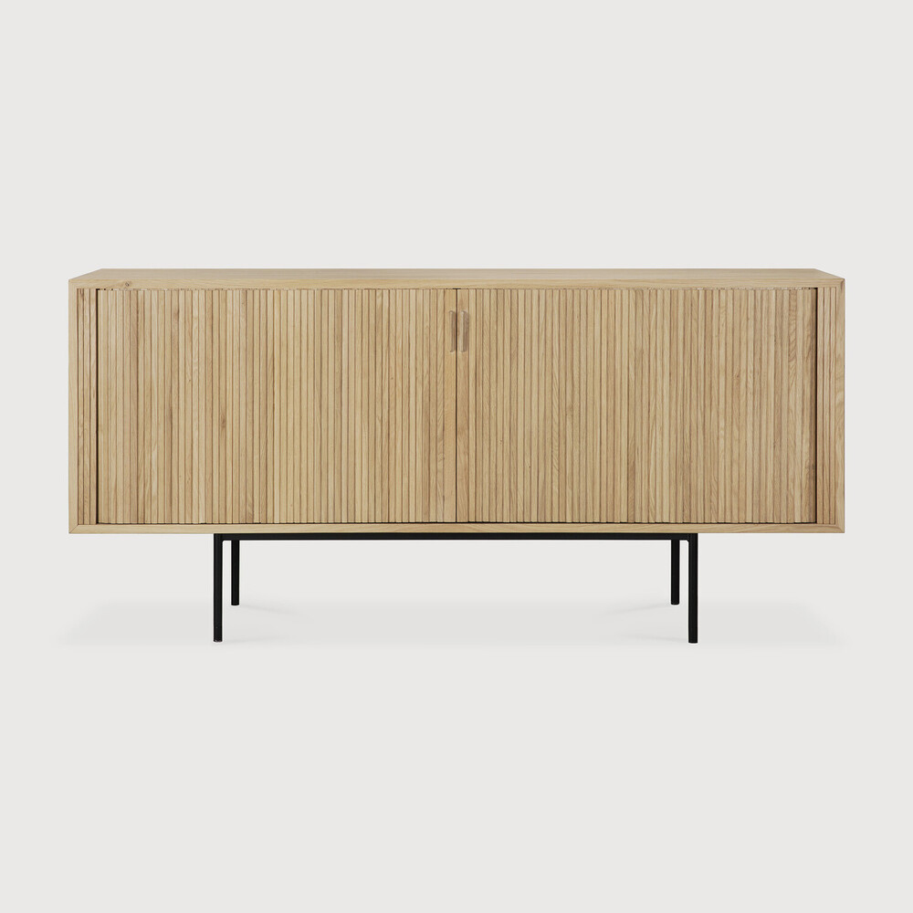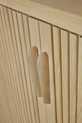 Le buffet Roller Max propose une solution de rangement fonctionnelle dans un design captivant. Doté de portes coulissantes, d'étagères réglables et de poignées discrètement intégrées dans le décor des portes, ce modèle illustre avec brio le motif strié du bois qui donne à cette collection tout son caractère. Le résultat est un design élégant et sophistiqué qui conviendra tant aux intérieurs.