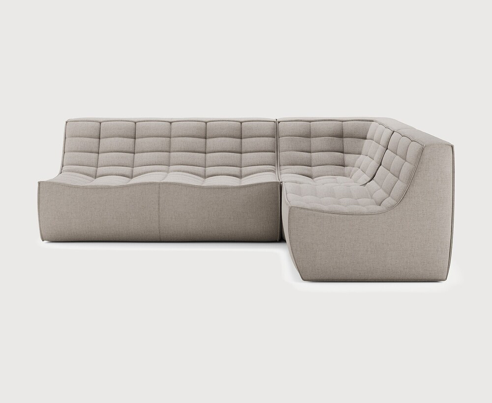 Composition canapé droit : module 2 places + module d'angle carré à 90° + module 1 place. Des connecteurs inclus pour relier les modules du canapé.