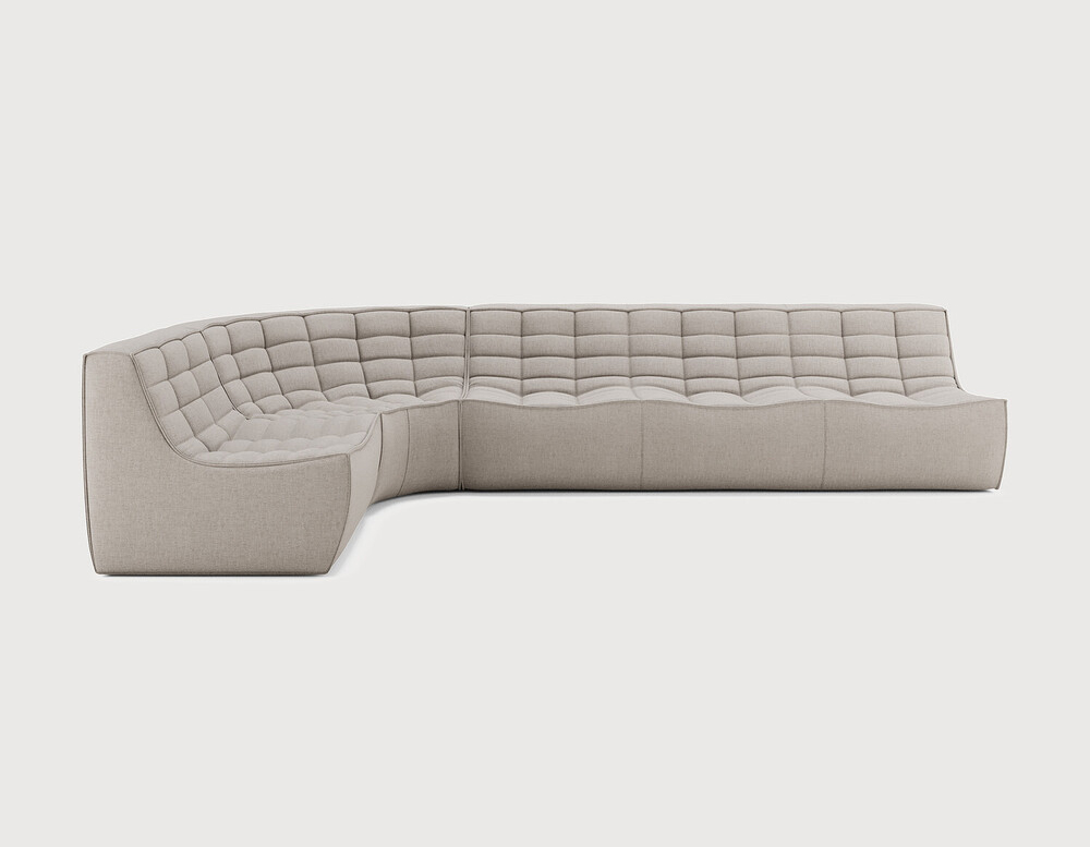 Composition canapé gauche : module 1 place + module d'angle carré à 90° + module 3 places. Des connecteurs inclus pour relier les modules du canapé.
