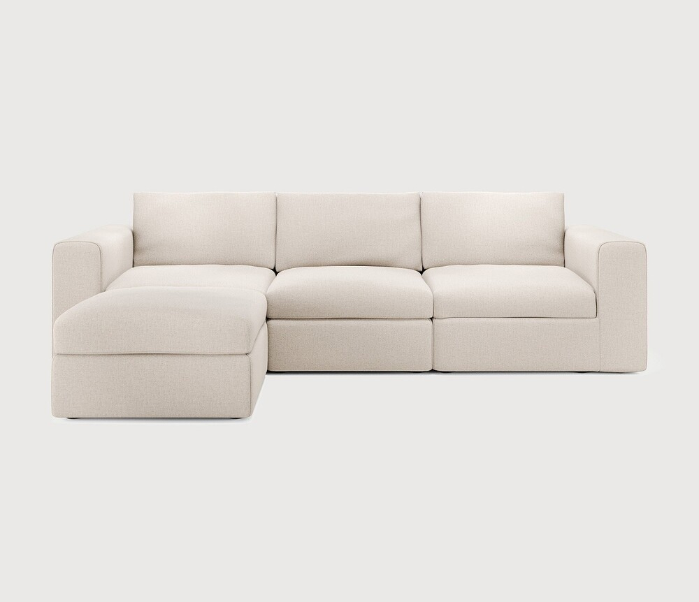 Composition canapé gauche : module 1 place + module d'extrémité avec accoudoir en L + accoudoir d'extrémité avec accoudoir en R + repose-pied. Tissu réalisé à partir de coton recyclé avec des fibres supplémentaires pour des performances techniques. Des connecteurs inclus pour relier les modules du canapé.