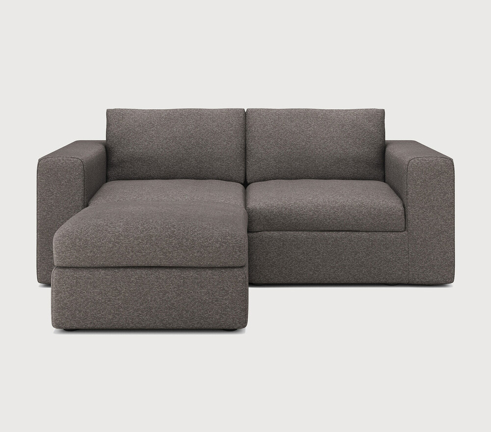 Composition canapé gauche : module d'extrémité avec accoudoir en L + module d'extrémité avec accoudoir en R + repose-pied. Tissu réalisé à partir de coton recyclé avec des fibres supplémentaires pour des performances techniques. Des connecteurs inclus pour relier les modules du canapé.