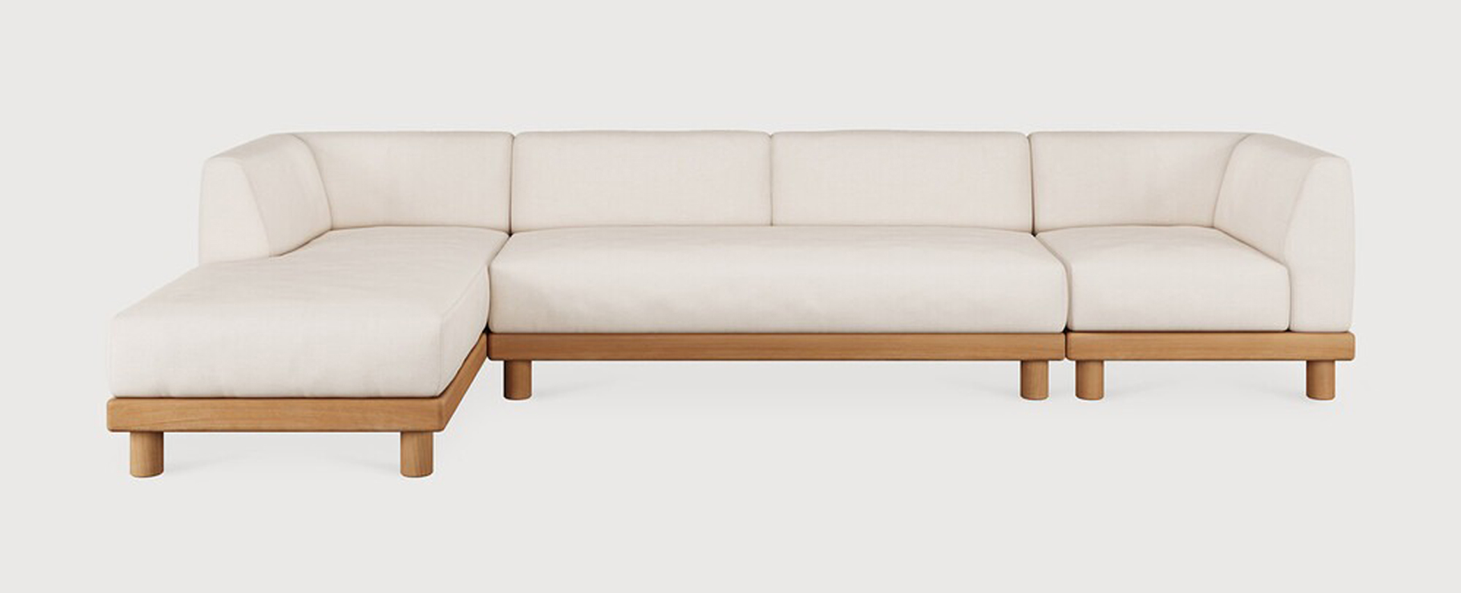 Ethnicraft Design. Jacques Deneef - Canapé modulaire de jardin Monocle à partir de 6374 € Dimensions : l 332 x h 72 x p 166 cm Combinant élégance et lignes épurées dans une silhouette décontractée, le canapé Monocle est raffiné, agréable et bien ancré au sol. Ses coussins moelleux vous permettent de profiter du confort de l'intérieur à l'extérieur, tandis que sa base en bois massif l'ancre bien au sol avec chaleur et équilibre. Faites votre choix parmi les options préconfigurées ou personnalisez votre installation et créez un canapé aussi unique que votre espace. Les cadres et les coussins peuvent être commandés ensemble ou séparément. Clips inclus pour relier les différents modules du canapé entre eux. Pour garantir la beauté naturelle du bois, ce modèle en teck n’a reçu aucune finition ni aucun traitement de protection. Pour plus d’informations, veuillez consulter nos consignes spécifiques pour l’entretien du mobilier de jardin. Fabriqués en 100% teck massif / Tissu 100% polyprop / Mousse à séchage rapide. canapé modulaire extérieur outdoor