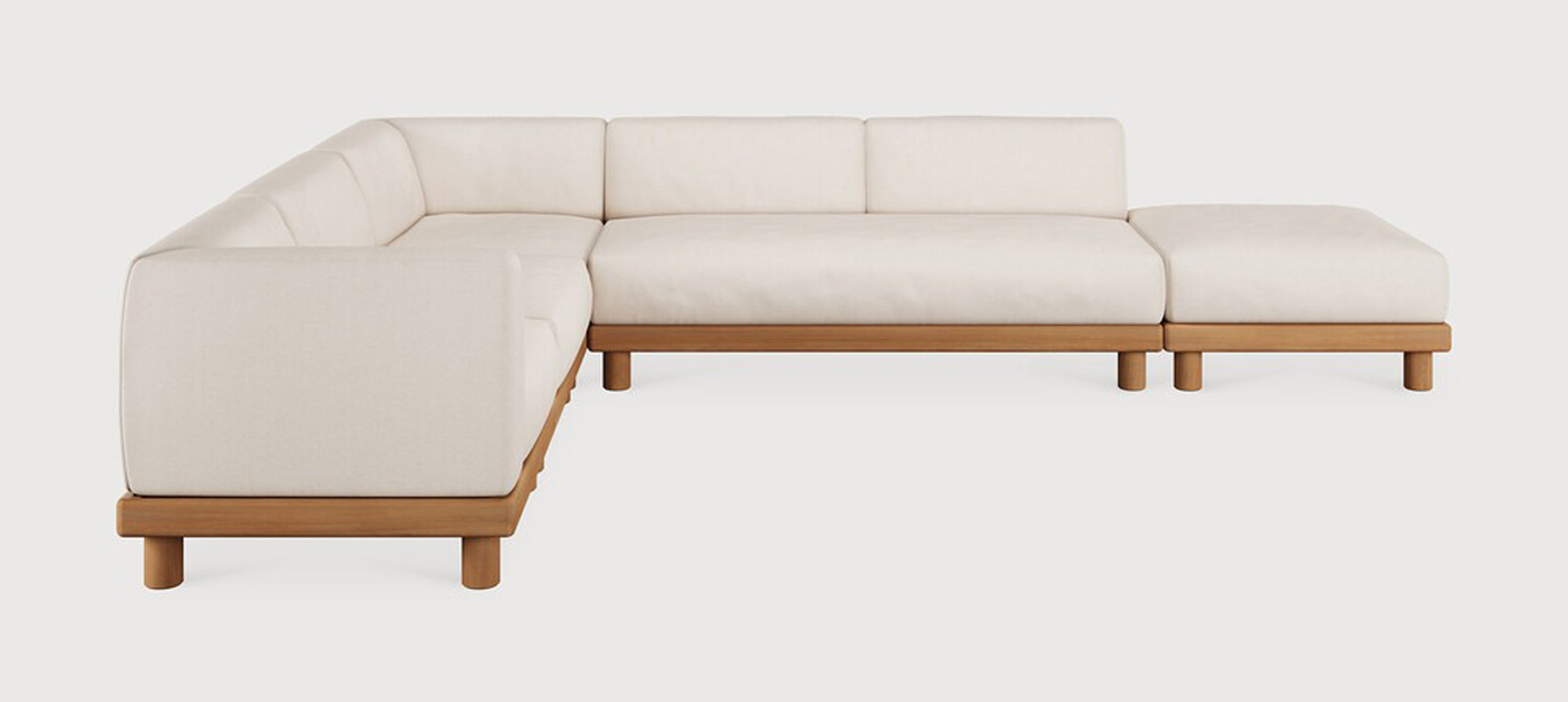 Ethnicraft Design. Jacques Deneef - Canapé modulaire de jardin Monocle à partir de 7910 € Dimensions : l 332 x h 72 x p 249 cm Combinant élégance et lignes épurées dans une silhouette décontractée, le canapé Monocle est raffiné, agréable et bien ancré au sol. Ses coussins moelleux vous permettent de profiter du confort de l'intérieur à l'extérieur, tandis que sa base en bois massif l'ancre bien au sol avec chaleur et équilibre. Faites votre choix parmi les options préconfigurées ou personnalisez votre installation et créez un canapé aussi unique que votre espace. Les cadres et les coussins peuvent être commandés ensemble ou séparément. Clips inclus pour relier les différents modules du canapé entre eux. Pour garantir la beauté naturelle du bois, ce modèle en teck n’a reçu aucune finition ni aucun traitement de protection. Pour plus d’informations, veuillez consulter nos consignes spécifiques pour l’entretien du mobilier de jardin. Fabriqués en 100% teck massif / Tissu 100% polyprop / Mousse à séchage rapide. canapé modulaire extérieur outdoor