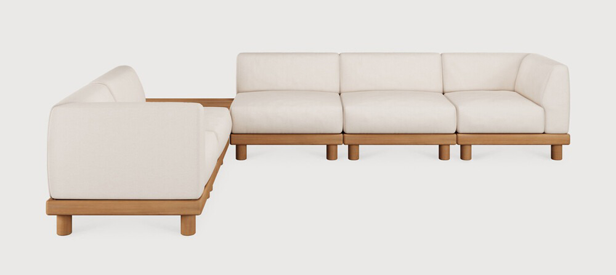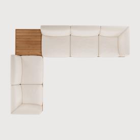 Ethnicraft Design. Jacques Deneef - Canapé modulaire de jardin Monocle à partir de 8289 € Dimensions : l 332 x h 72 x p 249 cm Combinant élégance et lignes épurées dans une silhouette décontractée, le canapé Monocle est raffiné, agréable et bien ancré au sol. Ses coussins moelleux vous permettent de profiter du confort de l'intérieur à l'extérieur, tandis que sa base en bois massif l'ancre bien au sol avec chaleur et équilibre. Faites votre choix parmi les options préconfigurées ou personnalisez votre installation et créez un canapé aussi unique que votre espace. Les cadres et les coussins peuvent être commandés ensemble ou séparément. Clips inclus pour relier les différents modules du canapé entre eux. Pour garantir la beauté naturelle du bois, ce modèle en teck n’a reçu aucune finition ni aucun traitement de protection. Pour plus d’informations, veuillez consulter nos consignes spécifiques pour l’entretien du mobilier de jardin. Fabriqués en 100% teck massif / Tissu 100% polyprop / Mousse à séchage rapide. canapé modulaire extérieur outdoor