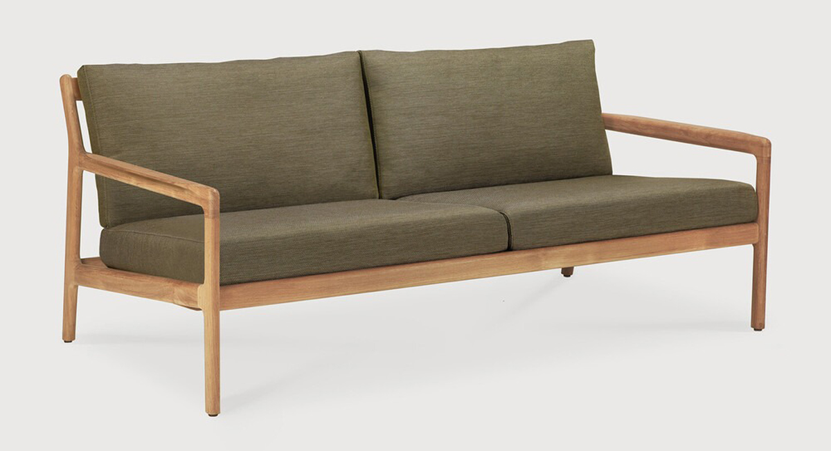 Ethnicraft Design. Jacques Deneef - Canapé de jardin Jack à partir de 2947 € Dimensions : l 180 x h 74 x p 90 cm La collection Jack offre des courbes et formes belles sous tous les angles. Doté d'un revêtement tissé en Belgique, chaque détail a été méticuleusement conçu pour assurer confort et élégance lorsque vous profitez de l'extérieur. Les cadres et les coussins peuvent être commandés ensemble ou séparément. Pour garantir la beauté naturelle du bois, ce modèle en teck n’a reçu aucune finition ni aucun traitement de protection. Pour plus d’informations, veuillez consulter nos consignes spécifiques pour l’entretien du mobilier de jardin. Fabriqués en 100% teck massif / Tissu 100% polyprop / Mousse à séchage rapide. canapé extérieur outdoor