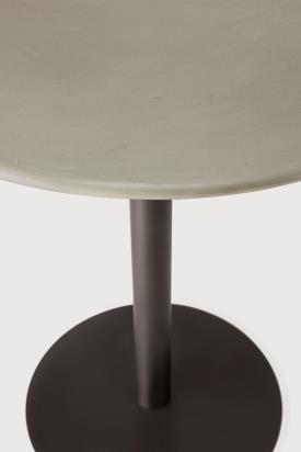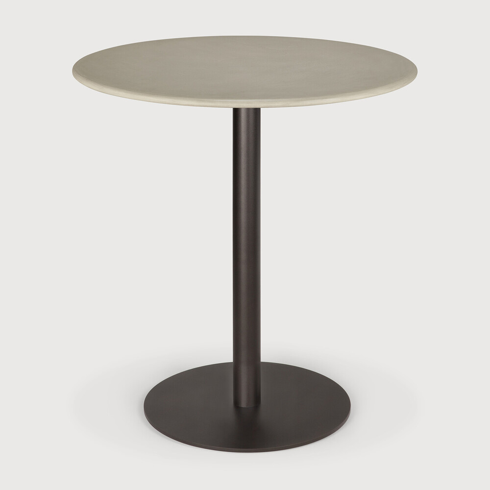 Le plateau de la table est réalisé en ciment fini à la main, scellé pour une protection optimale contre les éclaboussures et une utilisation extérieure quotidienne. La base est fabriquée en métal galvanisé thermolaqué couleur bronze foncé.