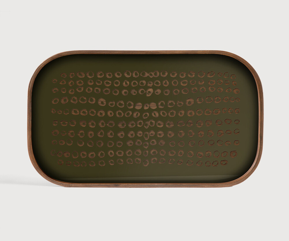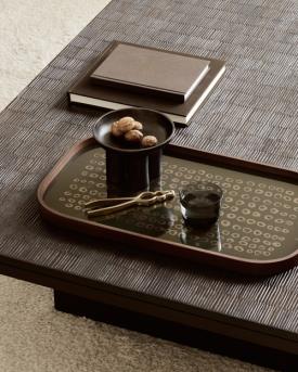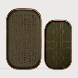 La collection de plateaux Second Nature s'inspire des formes organiques et des ombres abstraites de la nature : les empilements de pierres, l'écorce d'un arbre, les marques sur la carapace d'une tortue. Mélange harmonieux d'inspiration organique et de design contemporain, Second Nature combine parfaitement le verre imprimé à la main et la chaleur du bois. La richesse artistique du vert mousse et de la palette d'encre métallique confère une sophistication feutrée à son environnement.