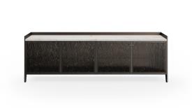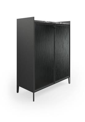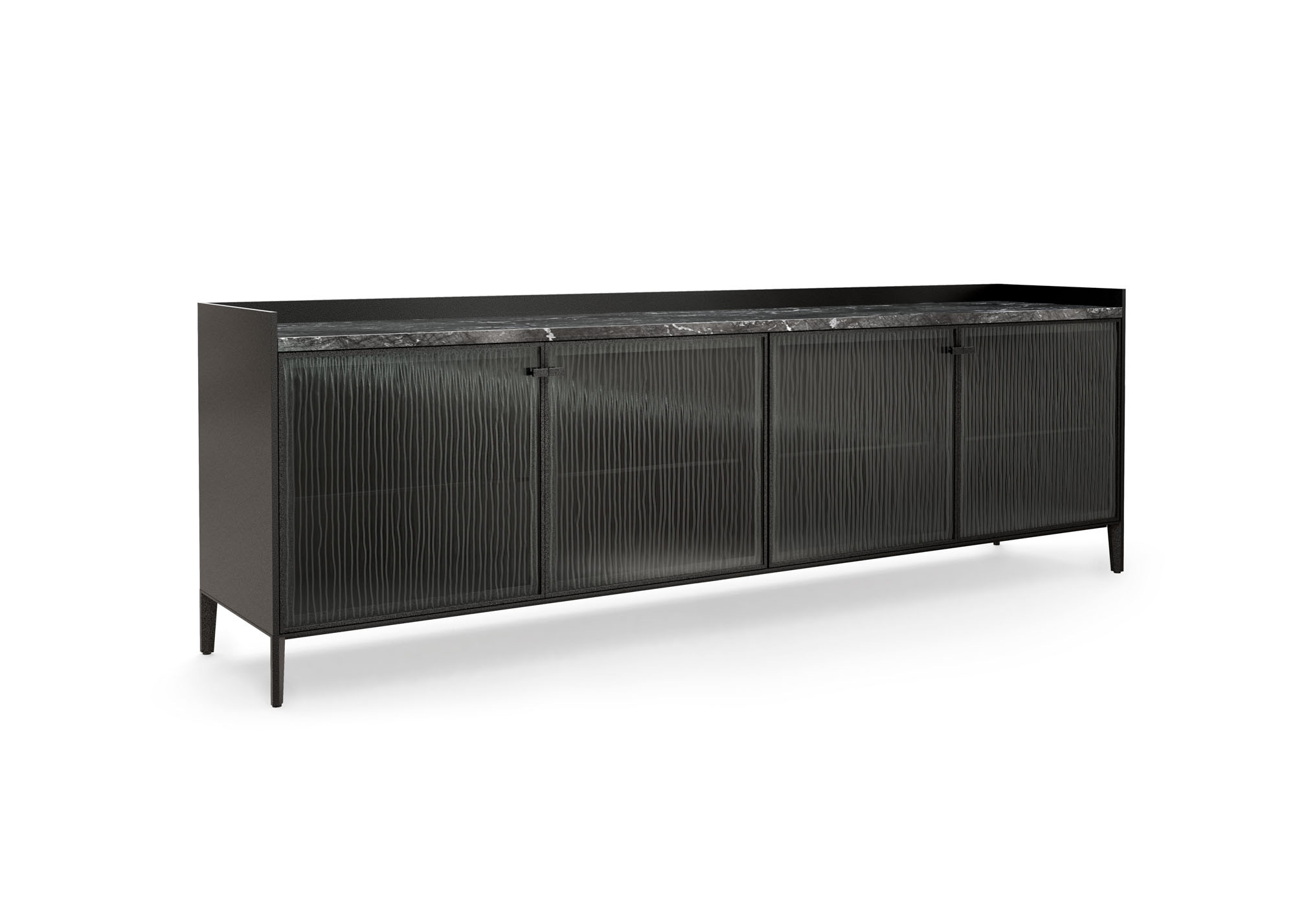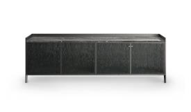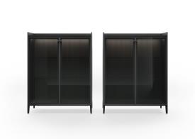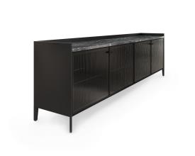 Fiam Design. Studio Klass Dimensions : l 115/196/260 x h 85/146 x p 50/53 cm Buffet avec structure en bois laqué Gris Volcan, Greige Métallisé ou Moka. Plateau en bois laqué assorti à la structure (14 mm d’épaisseur), ou en Marbre (40 mm d’épaisseur), ou en bois plaqué (40 mm d’épaisseur). Base et pieds en acier verni noir. Portes en verre trempé de 6 mm, en version lisse, en fusion ou dépolie, disponibles dans différentes finitions et laques. Les portes en verre sont fixées à un cadre en aluminium, finition noire, avec charnières dissimulées. Etagères intérieures en verre trempé de 12 mm. Système d’éclairage LED intégré dans la structure interne (en option).