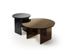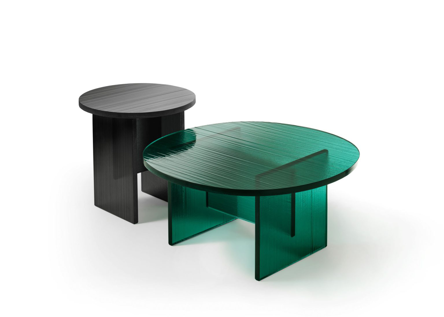 Design. Ceriani Szostak Dimensions : Ø 50/80 x h 40/50 cm table basse avec plateau et base en verre DV de 23 mm, disponible en finition fumée, bronze ou verte. Bords en finition semi-brillante.