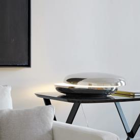 Fontana Arte Design Voon Wong and Benson Saw, 2003 - Réf. F542910200AXLE Dimensions : Ø 50 x h 17 cm Un objet lumineux au charme unique. La partie supérieure du corps pivote pour permettre une gestion complète de l'intensité de la lumière. Lampe de table avec lumière réglable par rotation de la partie supérieure. Structure en métal brillant. Câble d'alimentation, interrupteur et prise transparents. Led intégrée. lampe de table
