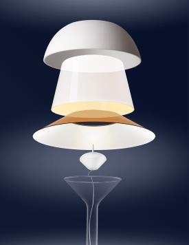 Une lampe de table raffinée dont les éléments de composition ont été réduits au minimum. Un support en verre transparent qui disparaît presque à la vue, un cœur lumineux et un diffuseur métallique autonome qui reflète la lumière sur le dessus, parfait pour éclairer un bureau.