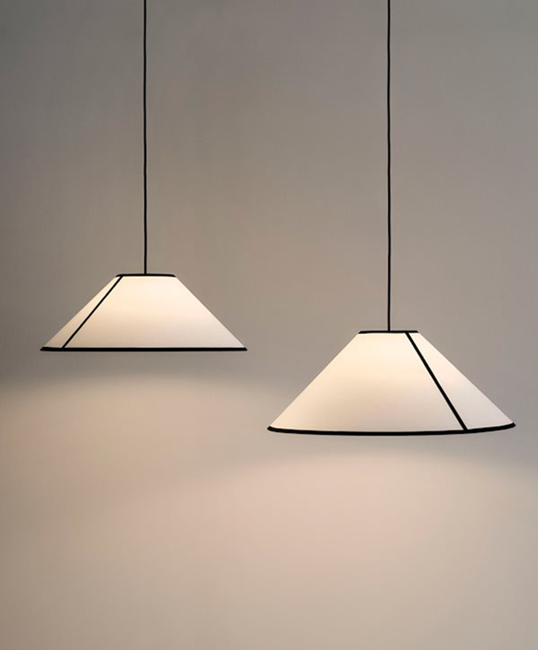Hay Design by Ana Kras Dimensions : l 50/60 x h 18,5/23,5 x p 50/60 cm Conçue pour HAY par Ana Kraš, la suspension Ava Cone allie une forme classique à un design graphique audacieux, réinterprétant avec modernité le style Empire. Fabriqué en ECOPET™ (un matériau issu du recyclage du PET), son abat-jour conique semi-translucide, à l'aspect papier, est mis en valeur par un passepoil en tissu contrastant. Avec son allure à la fois simple et saisissante, et sa douce lumière d'ambiance, Ava s'intègre harmonieusement dans de nombreux espaces de la maison : chambres, couloirs, salons et salles à manger. La suspension Ava Cone est fournie avec le câble d'alimentation standard HAY et utilise une ampoule LED dimmable compatible avec les modèles précédents. lampe suspension