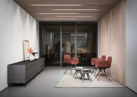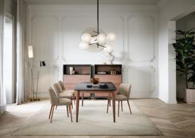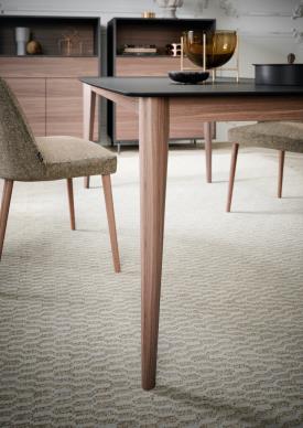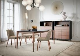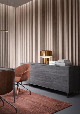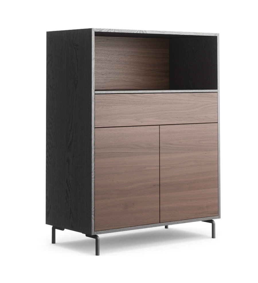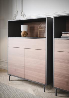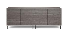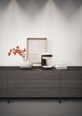 Buffet modulable avec plateau en bois (chêne ou noyer), fenix, hpl ou céramique et pied au choix (de 5 à 17 cm) en bois ou métal. Porte avec ouverture push-pull et tiroirs avec système Blumotion amorti. Possibilité de portes et tiroirs en fenix ou hpl. Façades intérieures affleurantes à la structure.