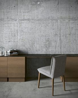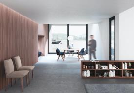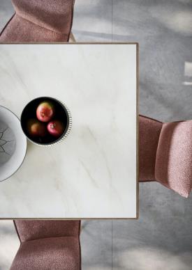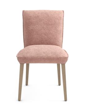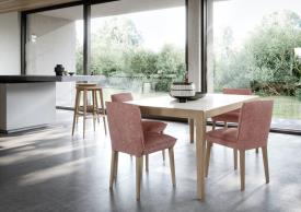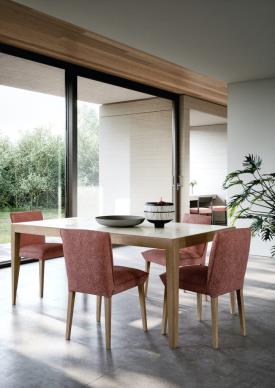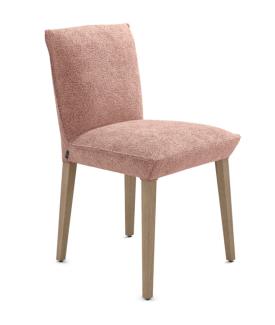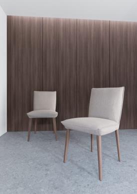 chaise avec coutures en relief et pieds en bois massif ; rembourrage assise (avec sangles élastiques) et dossier (sur toile tendue) avec superposition de 13 types d’expansé aux épaisseurs et aux densités différentes.