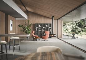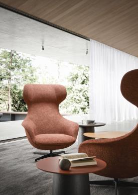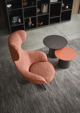 fauteuil composé d'une coque en polyuréthane souple moulée avec un insert en polyuréthane rigide. Les pieds en bois, lisses et arrondis, confèrent à l'assise une saveur artisanale.