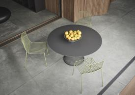 L'élément caractérisant la table Baobab réside dans l'important pied central en métal. Le plateau circulaire peut être en bois, fenix, Hpl ou céramique.