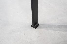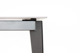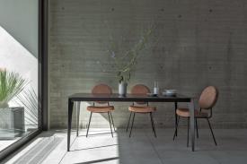 Table Mad avec base à quatre pieds. Pieds et structure en métal peint en noir ou blanc. Fixe ou extensible disponible avec plateau en bois, fenix, hpl, céramique. Adaptée à une utilisation en extérieur.
