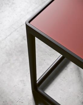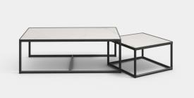 table basse modulable composée de trois éléments indépendants, dont un élément central aux dimensions majorées et deux éléments latéraux plus petits. Structure en métal verni et plateau en divers matériaux et finitions. Plateau à fleur avec la structure métallique.