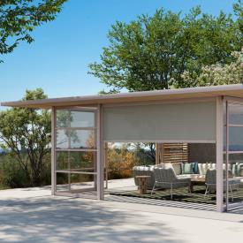 L'objectif de la conception de cette gamme de pavillons était d'harmoniser davantage le système avec l'architecture. Des outils ont été développés pour intégrer la gamme dans un contexte architectural afin de créer des espaces ouverts et fluides grâce à l'introduction d'éléments tels que la luminosité, la transparence et la légèreté structurelle, et de les intégrer plus efficacement à différents types d'environnements. La série Pavilion H se compose d'une structure en aluminium épurée, offrant un large choix de plafonds : étanches, en polycarbonate, vénitiens, bioclimatiques électriques, en aluminium, en bois, etc. ; de panneaux latéraux : panneaux coulissants en tissu, bois et aluminium, ou panneaux fixes avec étagères, stores réglables en aluminium ou en bois, panneaux latéraux en pierre et en verre, rideaux, etc. La gamme Pavilion H comprend également différents modèles de spots pour l'éclairage.