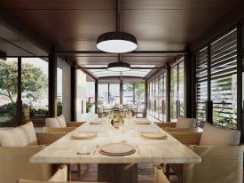Autre caractéristique remarquable du Pavillon V : l'utilisation de technologies bioclimatiques. Son implantation en milieu naturel souligne l'importance d'une conception respectueuse de l'environnement : matériaux durables à faibles émissions de CO₂, panneaux solaires pour une autonomie énergétique, verrière isolante et structure en aluminium recyclé à 75 %, facilement démontable et réutilisable dans un autre contexte. Le plafond bioclimatique assure une ventilation par le haut.