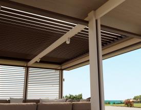 La structure se compose de portiques en aluminium espacés de deux mètres sur la longueur, soutenant une verrière isolante en porte-à-faux et offrant une grande modularité de construction. Les colonnes latérales encadrent et filtrent la vue sur le jardin. Les espaces ouverts entre les colonnes peuvent être aménagés avec différents revêtements : verre, persiennes pour moduler la lumière, rideaux, panneaux en grès cérame, placards, cuisinière, cheminée… afin de créer un espace sur mesure, adapté aux besoins du client.