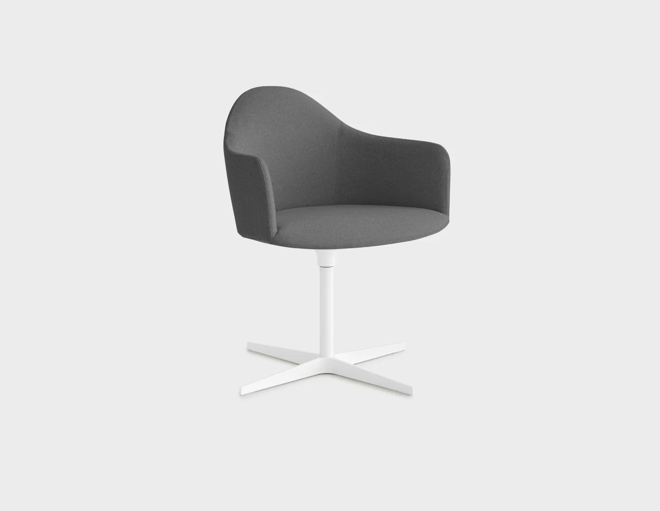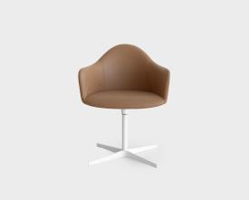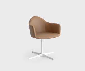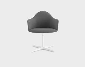Petit fauteuil avec coque en polyuréthane rigide Baydur® et mousse de polyuréthane ignifugée revêtu de tissu sans utilisation de colle. Piétement croix pivotant en aluminium microbillé ou laqué epoxy. Patins en polyéthylène.