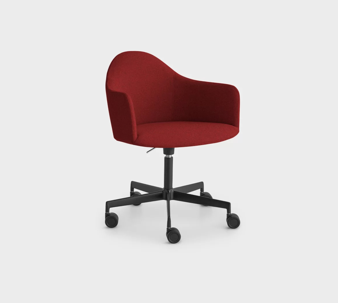 Lapalma Design. Anderssen et Voll, 2021 - fauteuil rembourré base 5 branches pivotante réglable Dimensions : l 64 x h 79/89 x p 58 cm Il rappelle à la mémoire le modernisme et une élégante simplicité. Mais le présent est celui de Lapalma et Anderssen & Voll, ou plutôt la tradition italienne et la rigueur de l'Europe du Nord. Ensemble, ils ont créé EDIT, un petit fauteuil d'un confort absolu dans le soutien et la largeur de l'assise, idéal pour se détendre dans n'importe quel environnement de travail, que ce soit dans les bureaux ou dans les salles de réunion. La structure est en aluminium et le piètement bas à cinq branches sur roulettes, pivotant et réglable en hauteur, garantit une liberté maximale. Tous les éléments sont recyclables : de la coque en polyuréthane à la mousse du rembourrage. Les pièces en bois proviennent de forêts certifiées FSC et du respect de Lapalma pour le futur de notre monde. Petit fauteuil avec coque en polyuréthane rigide Baydur® et mousse de polyuréthane ignifugée revêtu de tissu sans utilisation de colle. Base pivotante réglable en hauteur en aluminium microbillé ou laqué epoxy sur roulettes auto-bloquantes. fauteuil pivotant