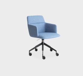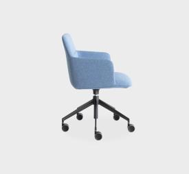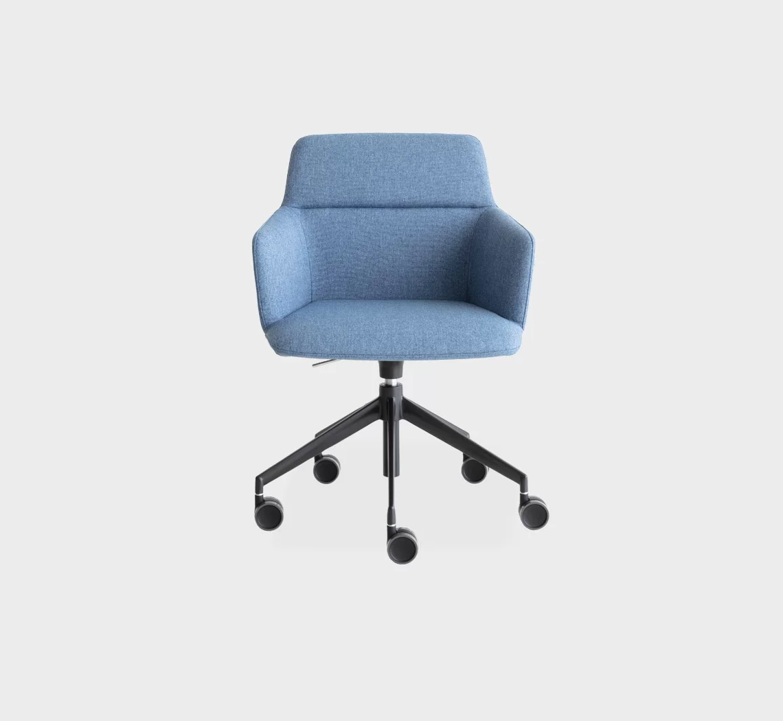 Lapalma Design. Francesco Rotan, 2022 - Fauteuil 5 branches sur roulettes Dimensions : l 58 x h 81 x p 54 cm Le monde tourne et le splendide fauteuil FOIL tourne aussi, en offrant un confort et une personnalité extraordinaires. Son profil élancé et dynamique descend du dossier enveloppant jusqu’à l’assise généreuse. Il est accompagné d’un piètement fluide en aluminium verni par poudrage, réglable en hauteur et doté de cinq roulettes hautes et auto-freinées. La coque, en mousse de polyuréthane ignifuge avec des inserts en polyuréthane rigide, est revêtue d’un large éventail de beaux tissus. Chaque élément est recyclable. Et chaque environnement de travail travaille aussi pour la nature. Petit fauteuil avec coque en polyuréthane rigide et mousse de polyuréthane ignifugée revêtu de tissu sans utilisation de colle. Base pivotante réglable en hauteur en aluminium laqué epoxy sur roulettes auto-bloquantes. fauteuil pivotant