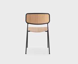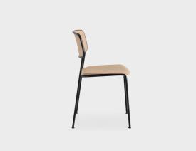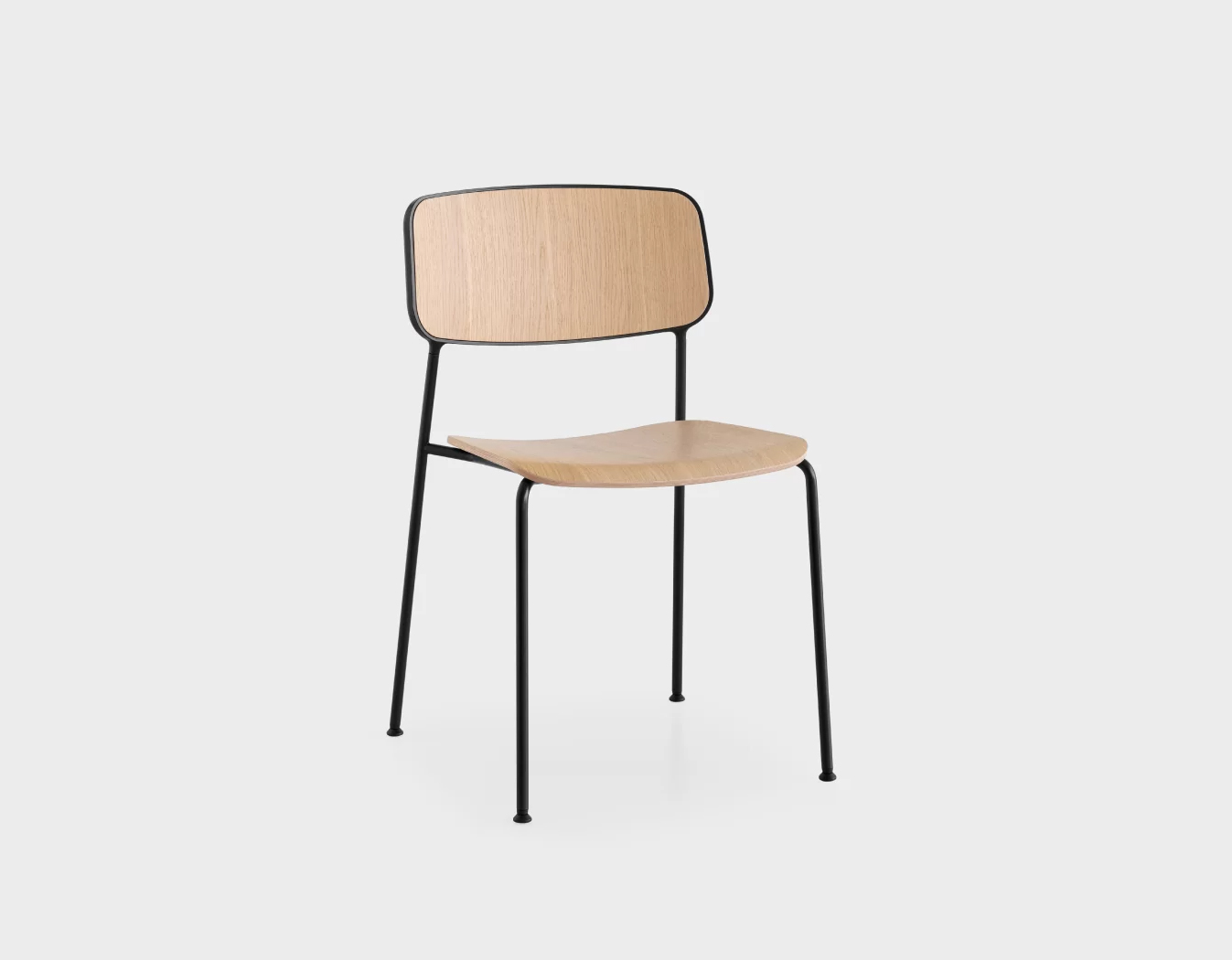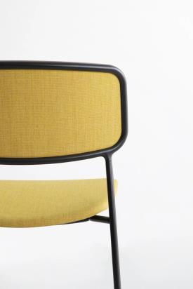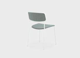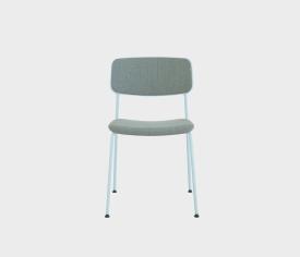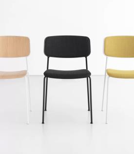 Chaise empilable avec 4 pieds en acier laqué epoxy. Assise et dossier en multiplis en plusieurs finitions ou rembourés en tissu. Le dossier est inséré dans une corniche d'alumimium laqué epoxy. Patins en nylons et feutre.