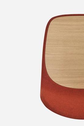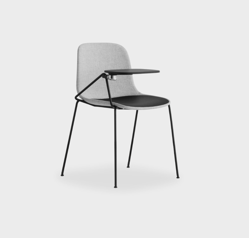 Coque en polypropylène ou revêtue en tissu avec galette en polypropylène, bois ou tissu integrée dans la coque facilement amovible et remplaçable. Disponible aussi une assise entièrement revêtue sans la galette amovible. Base avec 4 pieds en acier chromé mat ou laqué epoxy. Tablette écritoire abattante en hpl Fenix® blanc ou noir. Patins en nylon avec feutre.