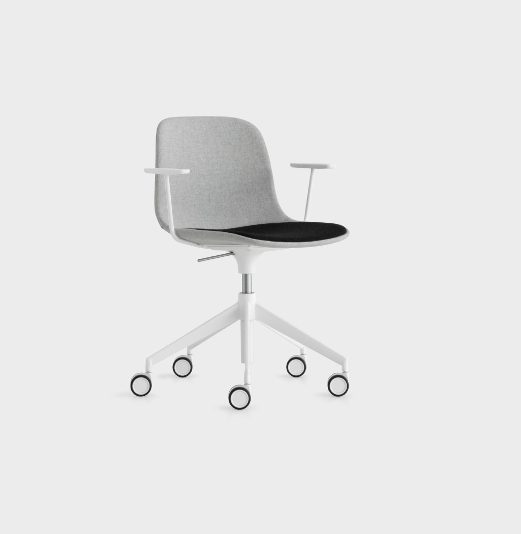 Lapalma Design. Antti Kotilainen, 2018 - Pivotant avec accoudoirs Dimensions : l 60 x h 75/85 x p 60 cm La chaise SEELA, dans sa version avec roulettes et accoudoirs, est idéale pour les salles de réunion et les bureaux. Pivotante et réglable en hauteur, elle se distingue des autres chaises grâce à sa galette personnalisable dans les finitions, ce qui fait d’elle bien plus qu'une chaise en plastique. Coque en polypropylène ou revêtue en tissu avec galette en polypropylène, bois ou tissu intégrée dans la coque facilement amovible et remplaçable. Disponible aussi une assise entièrement revêtue sans la galette amovible. Base pivotante avec accoudoirs, réglable en hauteur avec piétement en aluminium microbillé ou laqué epoxy sur roulettes auto-bloquantes. Accoudoirs en polypropylène. chaise pivotante