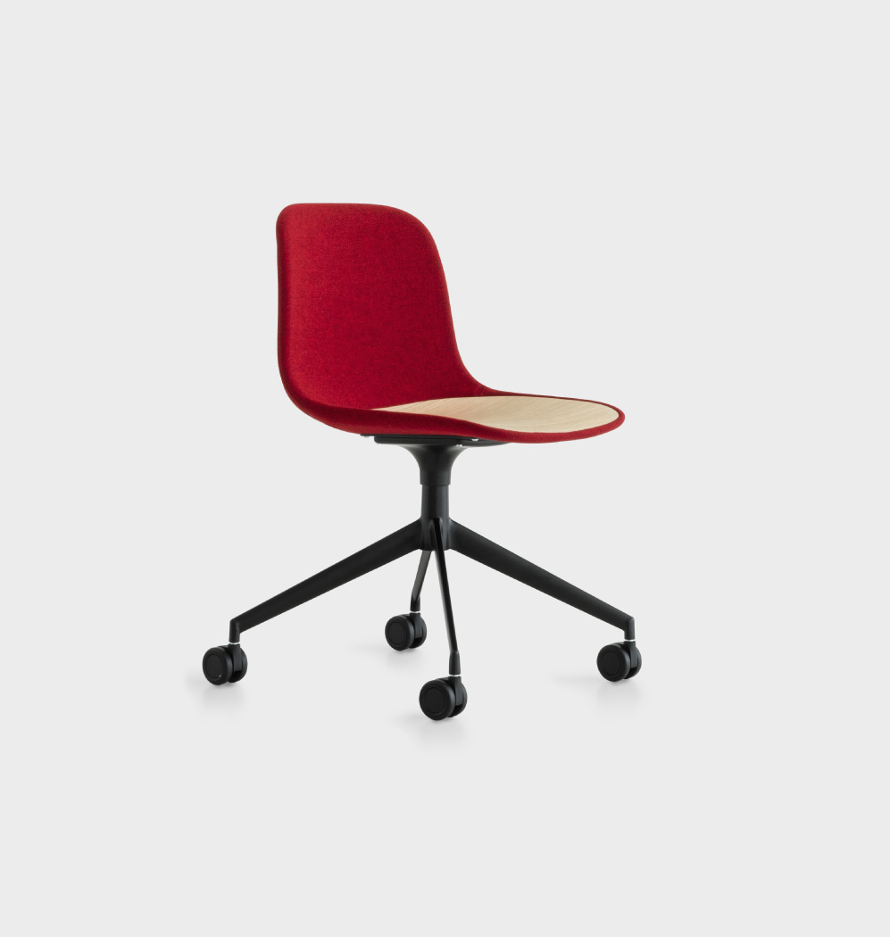 Lapalma Design. Antti Kotilainen, 2018 - A quatre branches sur roulettes Dimensions : l 50 x h 79 x p 53 cm SEELA existe en version à roulettes à hauteur fixe, idéale pour les salles de réunion, les salles de conférence et les bureaux. La coque en polypropylène avec sa galette intégrée en bois, tissu ou plastique repose sur une base à 4 roulettes. Grâce à la galette facilement remplaçable, les chaises peuvent être renouvelées au fil du temps, en suivant les modes ou tout simplement les besoins de ceux qui les utilisent. Coque en polypropylène ou revêtue en tissu avec galette en polypropylène, bois ou tissu intégrée dans la coque facilement amovible et remplaçable. Disponible aussi une assise entièrement revêtue sans la galette amovible. Base avec 4 pieds en aluminium microbillé ou laqué epoxy et roulettes auto-bloquantes. chaise pivotante