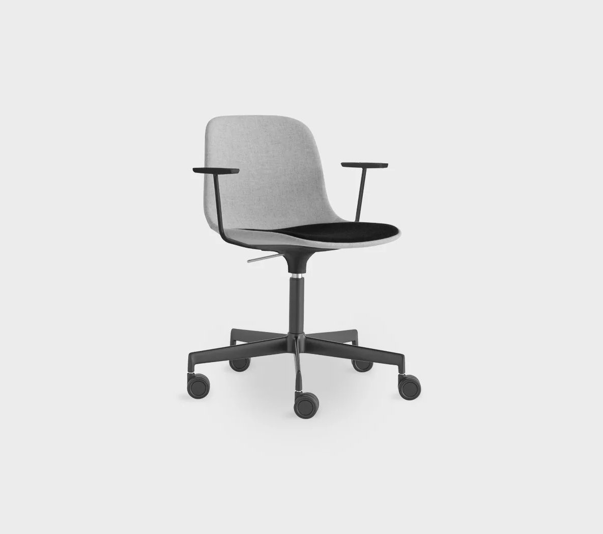 Lapalma Design. Antti Kotilainen, 2020 Dimensions : l 60 x h 75/85 x p 60 cm L’esthétisme minimaliste rencontre la fonctionnalité maximale. SEELA, dans la version chaise à 5 branches avec accoudoirs, est une proposition polyvalente pour les contextes réunion et bureau. Le piètement pivotant offre une liberté de mouvement tandis que les accoudoirs en polypropylène, qui peuvent être assortis à la couleur de la coque, fournissent un soutien en l’absence d’une table. Personnalisable dans ses couleurs et ses finitions, elle peut être renouvelée dans le temps grâce à la galette interchangeable. Un geste simple qui prolonge la durée de vie de la chaise, en réduisant les déchets. Coque en polypropylène ou revêtue en tissu avec galette en polypropylène, bois ou tissu integrée dans la coque facilement amovible et remplaçable. Disponible aussi une assise entièrement revêtue sans la galette amovible. Base pivotante avec accoudoirs, réglable en hauteur avec piétement en aluminium microbillé ou laqué epoxy sur roulettes auto-bloquantes. Accoudoirs en polypropylène. chaise pivotante