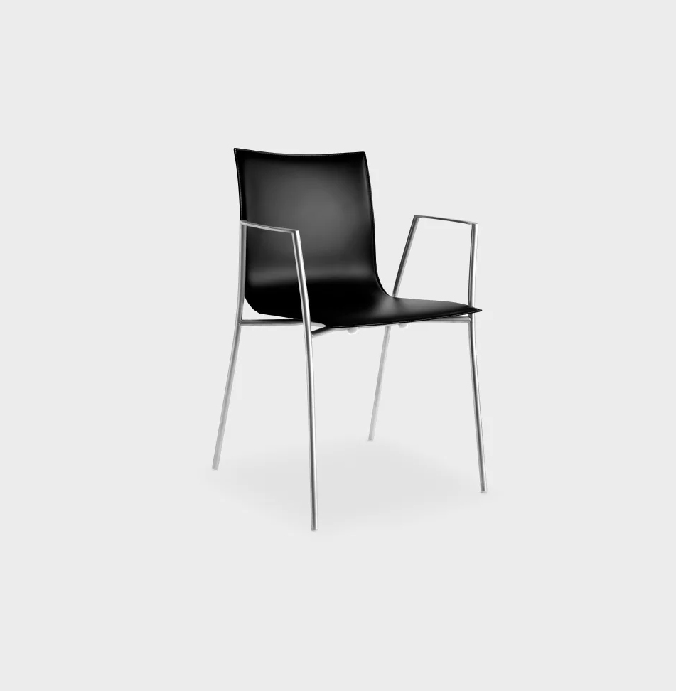 Chaise empilable avec 4 pieds et accoudoir en acier inox Aisi 304 microbillé. Coque en multiplis de bois avec épaisseurs differents disponible en plusieurs finitions de bois ou complètement revêtue en cuir avec coutures apparentes. Pour cette chaise c’est aussi disponible un coussin en peau. Pieds en nylon avec feutre. Disponible aussi en version tabouret réglable en hauteur.