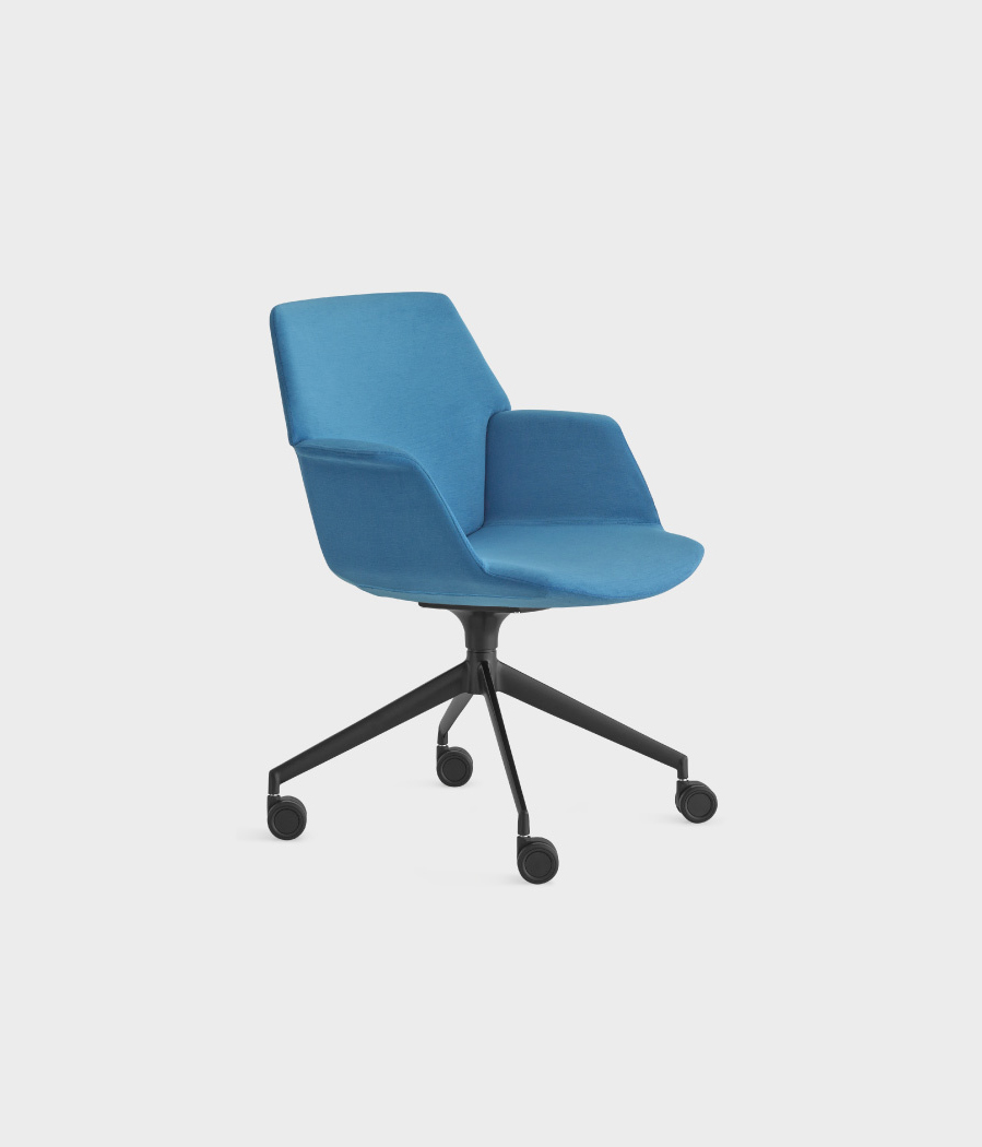 Famille de chaises, avec assise et dossier en différentes hauteurs en mousse ignifugée revêtue en tissu, peu ou eco-peau. Plusieurs bases disponibles: pivotante, réglable en hauteur, sur roulettes, en fusion d' aluminium en plusieurs finitions. Disponible aussi avec le mécanisme de bascule.