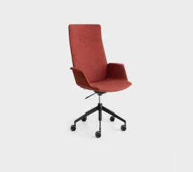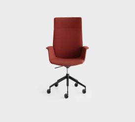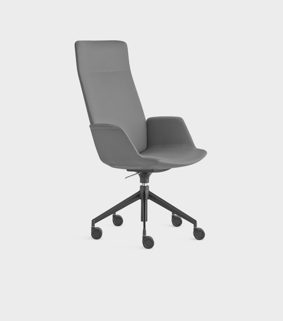 La hauteur réglable et les roulettes sont des éléments très fonctionnels, qui allègent l'empreinte directionnelle de cette chaise UNO à haut dossier et profil géométrique.