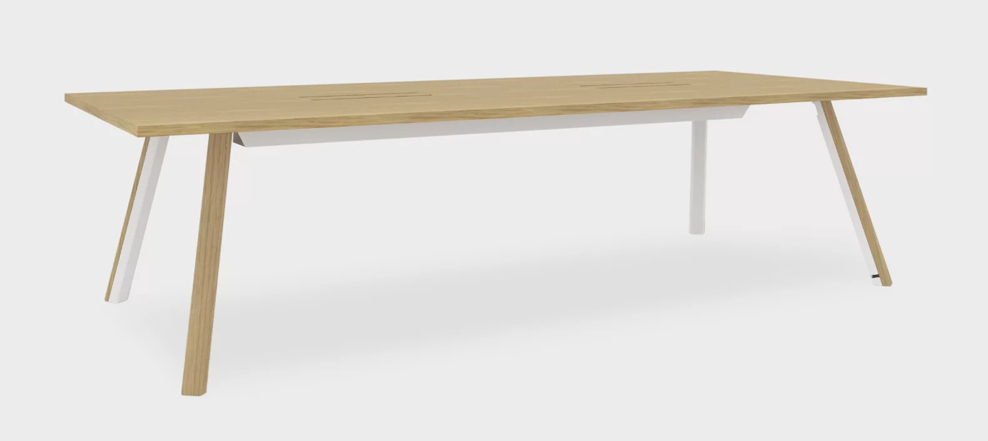 Plateau en MDF revêtu en chêne blanchi, teinté noir pore ouvert ou Hpl Fenix. Passecâbles dans la même finition avec goulotte en métal plié laqué époxy pour le câblage.