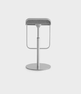 tabouret pivotant réglable en hauteur avec structure en acier chromé mat et base revêtue en acier inox Ainsi 304 finition “toile de lin” ou complètement laqué époxy. Piston chromé mat. Assise en multiplies courbé en plusieurs finitions. Patins en feutre sous la base.