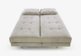 Coussins d'assise et dos formant matelas en mousses de polyuréthane haute résilience Bultex combinant plusieurs densités : une âme en 37 kg/m3 - 2,6 kPa, une couche de confort en 32 kg/m3 - 2,1 kPa et un parement en 26 kg/m3 - 1,25kPa. Coussins oreillers / cale-reins en ouate de polyester. Dimension du couchage 140 x 200 cm épaisseur 16 cm.