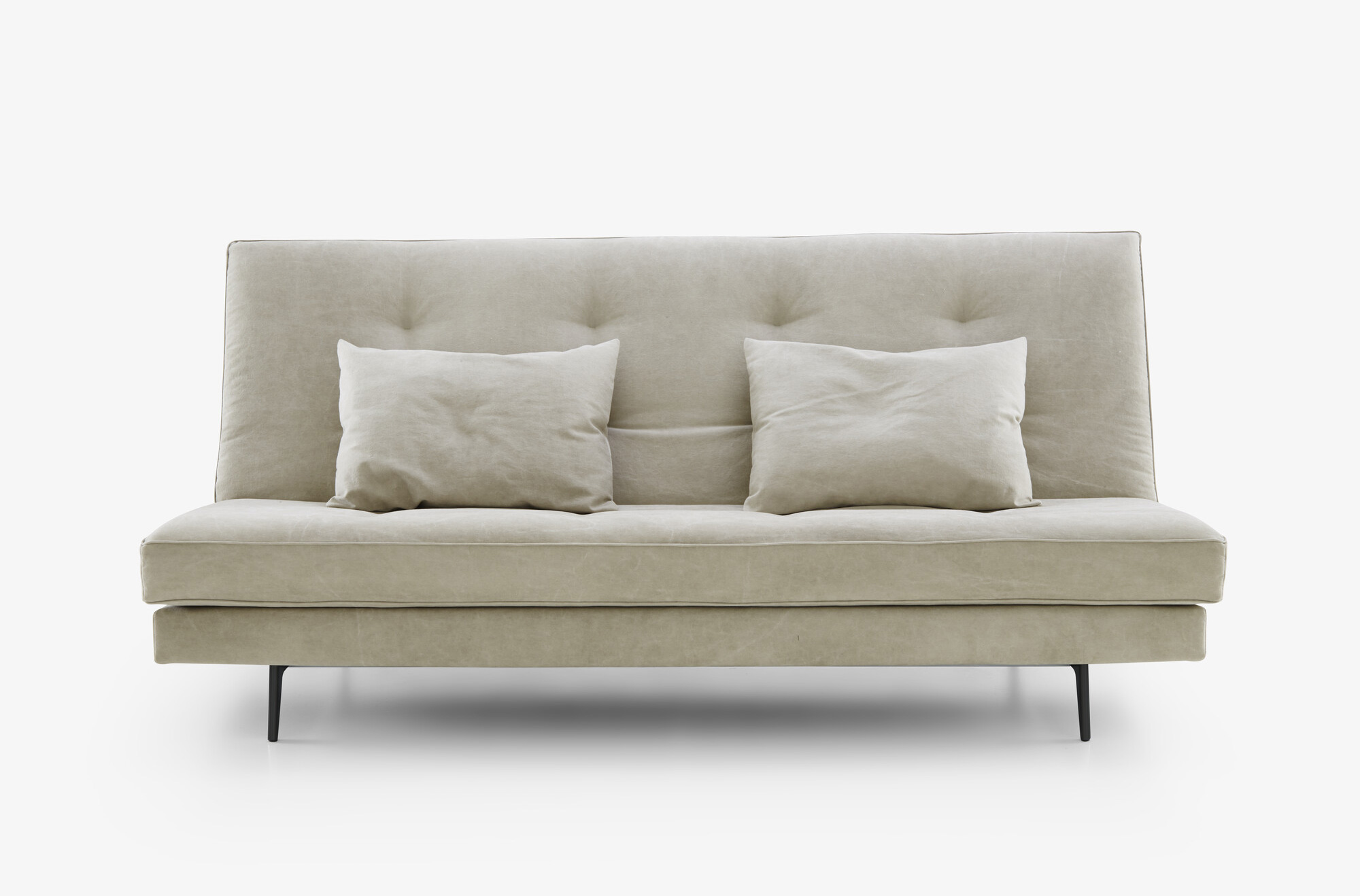 Un souci délibéré d'élégance pour une banquette-lit d'usage quotidien : les pieds en fonte d'aluminium à l'esthétique affirmée, les proportions harmonieuses, le coussinage traditionnel traité façon matelas à l'ancienne avec bourrelet et capitons évoquent davantage un très beau canapé d'inspiration ''30'' qu'une simple banquette-lit.