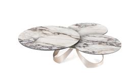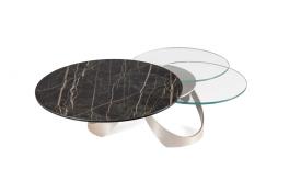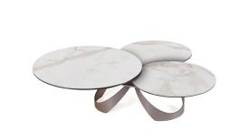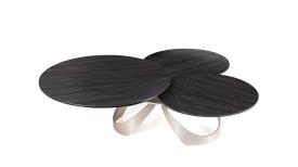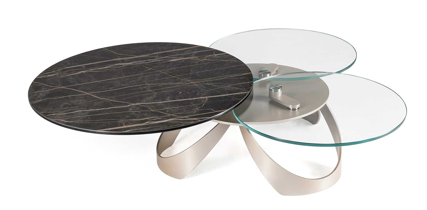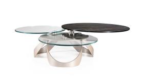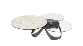 Naos Design A. Casati Dimensions : l 85/142 x h 35 x p 85/130 cm table de salon extensible avec 3 plateaux en verre ou en céramique. Equipé d’un mécanisme novateur d’ouverture synchronisée qui permet aux 3 plateaux de s’ouvrir d’un seul geste mais en direction opposée. Structure en métal laqué.