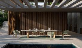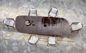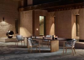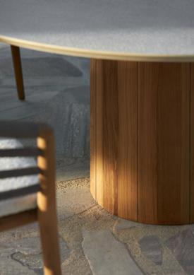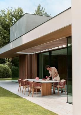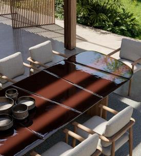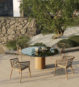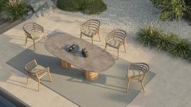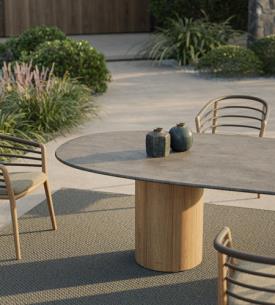 Royal Botania Design. Kris Van Puyvelde Dimensions : l 310/.../490 x h 75 x p 120/130/140 cm - Ø 120/.../160 x h 75 cm La table Regaliz se distingue par ses puissants piètements ovales en teck associés à un plateau en verre sculptural. Le verre est proposé en trois finitions raffinées : vert foncé, brun foncé et pebble. Réalisée selon un procédé de fusion spécifique, la surface révèle une texture et une profondeur uniques. Dans sa version à piètements ovales, la table Regaliz est disponible en longueurs de 310 à 490 cm. Au-delà du verre, la table est compatible avec l’ensemble des plateaux céramiques non ronds de Royal Botania, offrant une grande liberté de choix en matière de matériaux et de nuances. Depuis cette année, Regaliz est également proposée avec tous les plateaux en lave, réalisés en pierre de lave émaillée, naturellement texturée, élégamment raffinée et dotée d’une résistance exceptionnelle aux intempéries, à l’usure et au temps. Regaliz est désormais aussi disponible avec un piètement rond. Cette configuration permet d’accueillir des plateaux ronds de 120 à 160 cm, ou deux piètements ronds pour des plateaux de plus grandes dimensions. Le piètement rond Regaliz est également proposé en version low lounge. Par ses proportions généreuses et sa présence architecturale affirmée, la table Regaliz conjugue confort, échelle et caractère, et s’impose naturellement comme la pièce centrale de tout espace extérieur. table extérieur outdoor