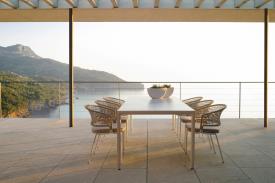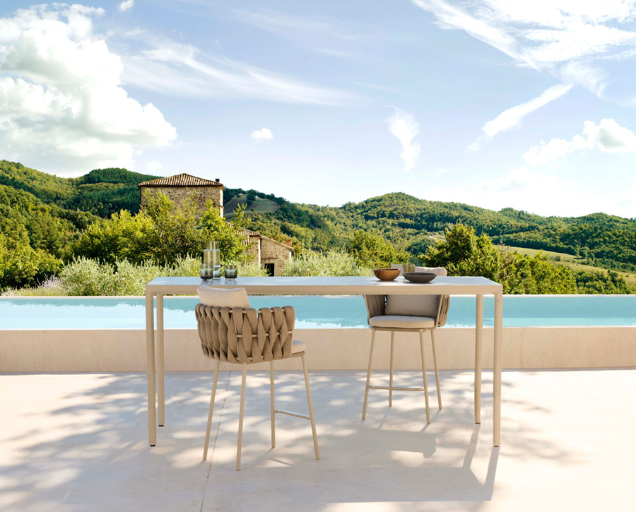 Les designs les plus simples sont souvent les plus élégants. La table à hauteur de comptoir Illum, qui est 13 cm plus basse que la table de bar ordinaire, est une subtile déclaration de style. Elle constitue le cadre idéal pour les apéritifs en plein air. Les lignes légèrement incurvées du mince cadre en aluminium ont une apparence plus sculptée que moulée. Le plateau est disponible en teck provenant de plantations de l'est de Java ou dans de nombreuses teintes subtiles de céramique.